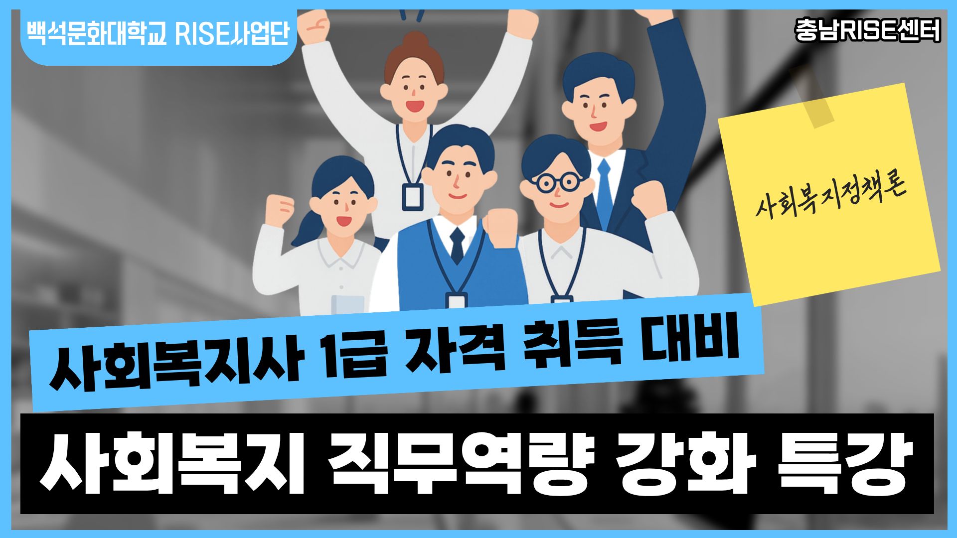 사회복지학과 재학생 및 졸업생을 대상으로 사회복지전문가로서 역량을 강화하고, 사회복지사 1급 국가고시 대비 8개 시험과목을 중심으로 자격시험 대비를 위한 강좌를 개설한다 .